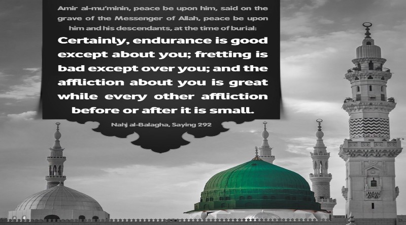 قالَ الإمام علي عَلَيْهِ اَلسَّلاَمُ: عَلَى قَبْرِ رَسُولِ اَللَّهِ صَلَّى اَللَّهُ عَلَيْهِ وَ آلِهِ سَاعَةَ دَفْنِهِ: إِنَّ اَلصَّبْرَ لَجَمِيلٌ إِلاَّ…
