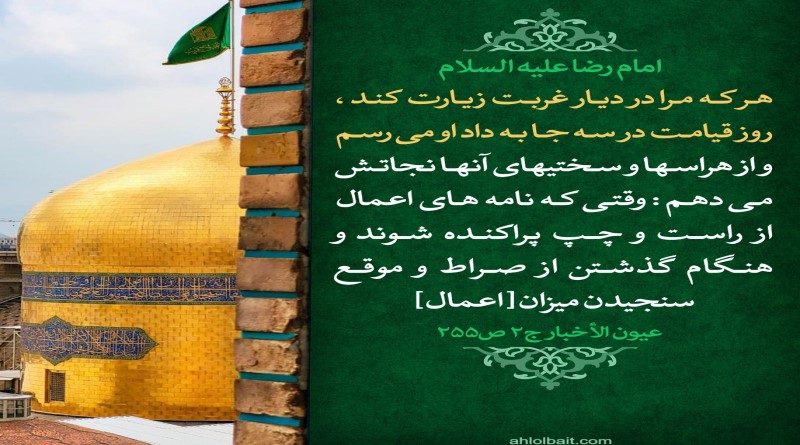 امام رضا علیه السلام منْ زَارَنِي عَلَى بُعْدِ دَارِي أَتَيْتُهُ يَوْمَ اَلْقِيَامَةِ فِي ثَلاَثَةِ مَوَاطِنَ حَتَّى أُخَلِّصَهُ مِنْ أَهْوَالِهَا إِذَا…