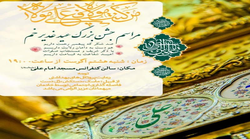 مراسم جشن بزرگ عید غدیرخم روز شنبه هشتم آگوست از ساعت 19 در سالن کنفرانس مسجد امام علی علیه السلام…