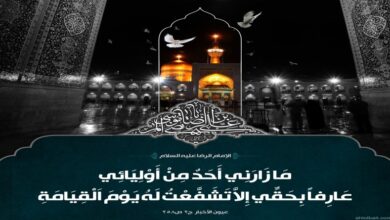 الإمام الرضا عليه السلام ما زَارَنِي أَحَدٌ مِنْ أَوْلِيَائِي عَارِفاً بِحَقِّي إِلاَّ تَشَفَّعْتُ لَهُ يَوْمَ اَلْقِيَامَةِ عيون الأخبار ج2 ص258