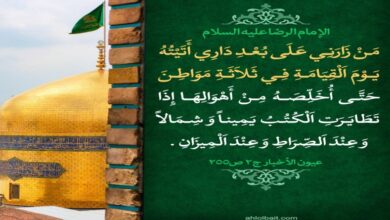 امام رضا علیه السلام منْ زَارَنِي عَلَى بُعْدِ دَارِي أَتَيْتُهُ يَوْمَ اَلْقِيَامَةِ فِي ثَلاَثَةِ مَوَاطِنَ حَتَّى أُخَلِّصَهُ مِنْ أَهْوَالِهَا إِذَا…