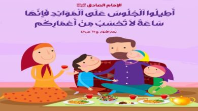 الإمام الصادق عليه السلام أطِيلُوا اَلْجُلُوسَ عَلَى اَلْمَوَائِدِ فَإِنَّهَا سَاعَةٌ لاَ تُحْسَبُ مِنْ أَعْمَارِكُمْ بحار الأنوار ج63 ص411