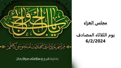 مجلس عزاء بسم الله الرحمن الرحيم السلام على المعذب في قعر السجون وظلم المطامير، ذي الساق المرضوض بحلق القيود .…