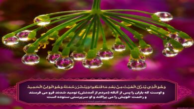 وهُوَ الَّذِي يُنَزِّلُ الْغَيْثَ مِنْ بَعْدِ مَا قَنَطُوا وَيَنْشُرُ رَحْمَتَهُ وَهُوَ الْوَلِيُّ الْحَمِيدُ و اوست كه باران را پس از…