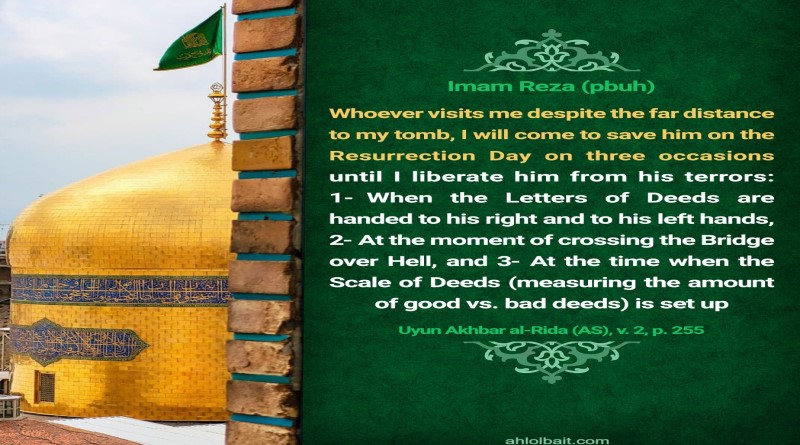 Read moreImam Reza (pbuh) منْ زَارَنِي عَلَى بُعْدِ دَارِي أَتَيْتُهُ يَوْمَ اَلْقِيَامَةِ فِي ثَلاَثَةِ مَوَاطِنَ حَتَّى أُخَلِّصَهُ مِنْ أَهْوَالِهَا إِذَا تَطَايَرَتِ